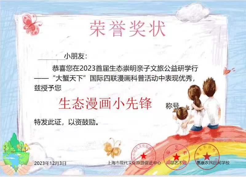 近日,由上海市现代文化旅游促进中心主办,上海视觉艺术学院、国际环保四联漫画大赛组委会协办,首届生态崇明亲子文旅体公益研学行暨“大蟹天下”国际环保四联漫画科普活动,在联袂承办的上海崇明惠康农民田间学校、高邸艺术馆圆满落幕。本次活动邀请了沪上20组亲子家庭参与体验。
